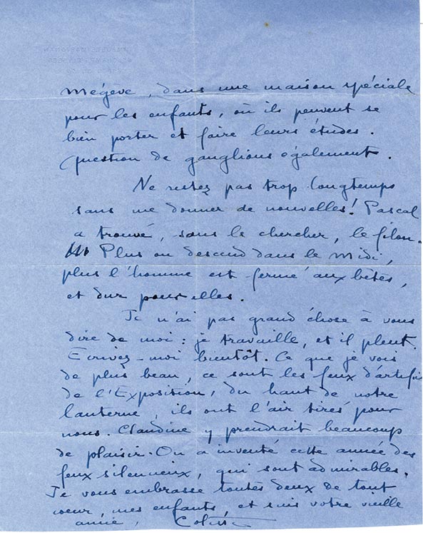 Lettre autographe signéeLettre autographe signée, adressée à Mme Beaurain. [Paris], 27 octobre 1937 ; 2 pages grand in-4°, enveloppe jointe. En-tête « Immeuble Marignan 33 Champs Élysées ».« Alors ? Ma petite Claudine ne veut pas quitter son rhume ?...