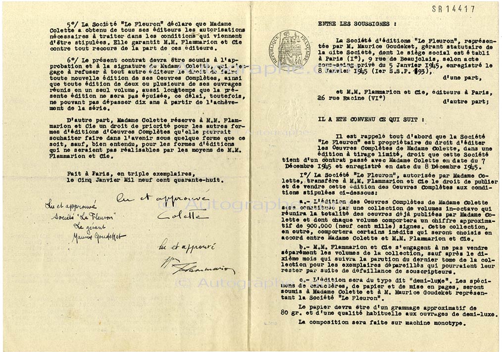 Pièce signéePièce signée. 5 janvier 1948 ; 4 pages in-4°. Contrat dactylographié, signé par Colette, Maurice Goudeket et MM. Flammarion et Cie sur « le droit d’éditer les Œuvres Complètes de Madame Colette […]. La Société Le Fleuron,...
