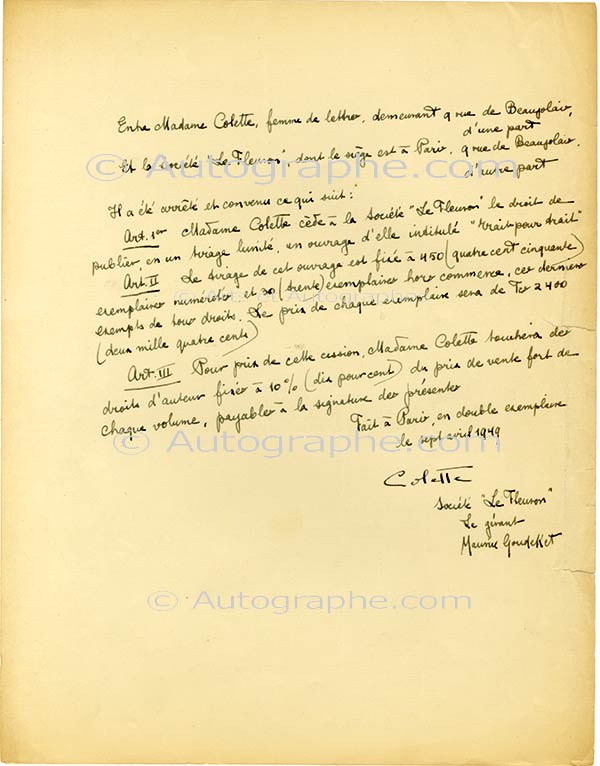 Pièce signéePièce signée. 7 avril 1949 ; 1 page in-4°.Contrat (rédigé par Maurice Goudeket) signé avec Colette et la société Le Fleuron pour le droit de publier « un ouvrage d’elle intitulé Trait pour Trait […]. Le tirage de cet ouvrage...