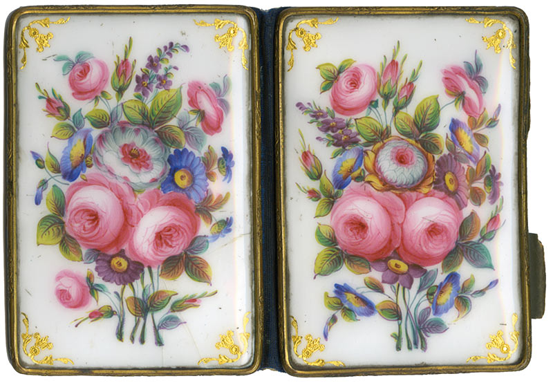 Précieux objet intime« Carnet intime ».9,5 x 6,5 cm. Semainier inséré dans une reliure constituée de deux plaques de porcelaine décorées de bouquets floraux à base de roses dans une monture de métal doré, dos de velours bleu, restes d’un porte...