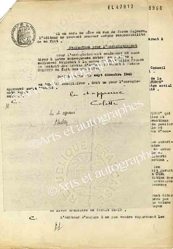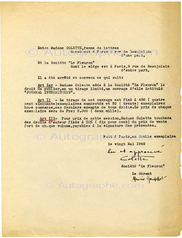 Pièce signéePièce signée. Paris, 7 décembre 1945 ; 2 pages 1/2 in-4°. Contrat signé entre Colette et Le Fleuron . « Mme Colette confère à la société Le Fleuron qui l’accepte et ce, dans les termes des lois actuelles et futures tant...