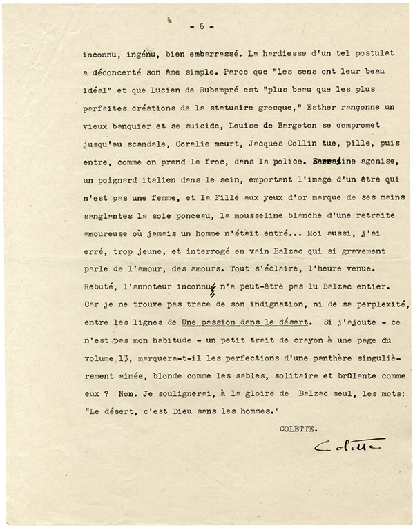 Pièce dactylographiée signéePièce signée. Sans date ; 6 pages in-4°, avec corrections autographes. Très intéressant article dactylographié sur Balzac. « Quand je pénétrai dans cette jungle, La Comédie humaine, je navais pas plus de sept ans. Quon ne...