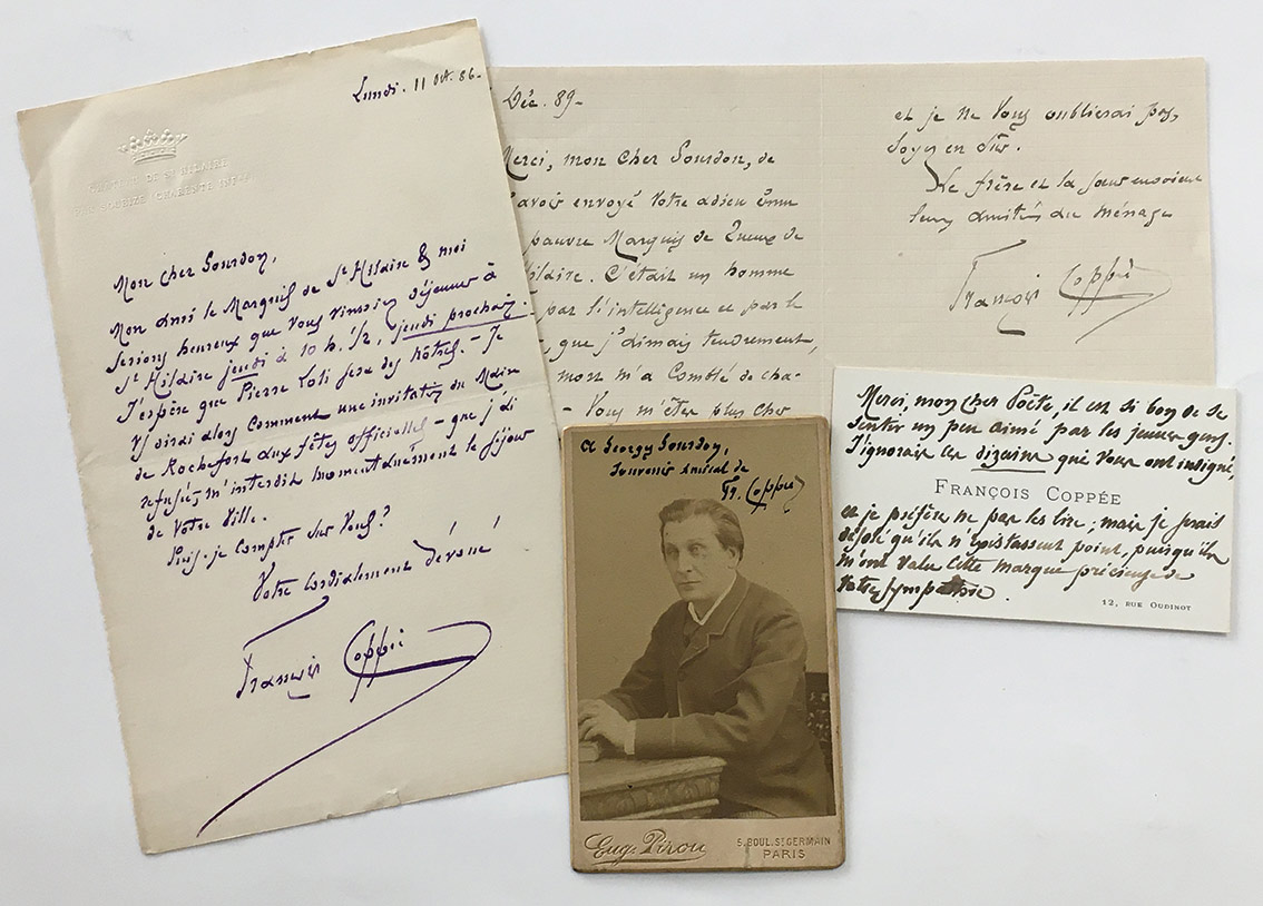 Intéressant ensemble adressé au poète et journaliste Georges BourdonIntéressant ensemble adressé au poète et journaliste Georges Gourdon : Lettre autographe signée. 11 octobre 1886 ; 1 page in-12. « Mon ami le Marquis de St Hilaire & moi serions heureux que vous vinssiez déjeuner à St Hilaire...
