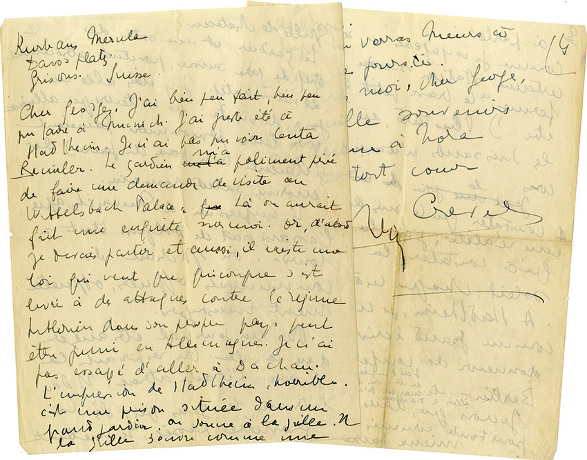 Manuscrit autographe signéLettre autographe signée [adressée à Georges Limbour ? ]. Sans date, écrite des Grisons en Suisse ; 4 pages in-4°. « Jai bien peu fait, bien peu pu faire à Munich. Jai juste été à Stadelheim [ ] Le gardien ma poliment...
