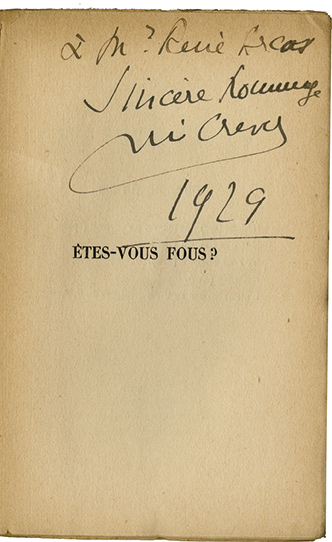 E.O. avec envoi autographe signé« Êtes-vous fous ? ». Éditions Gallimard, NRF, Paris, 1929 ; 18,7 x 12 cm, broché. Édition originale en service de presse. Rare envoi autographe signé, adressé à René Arcos.