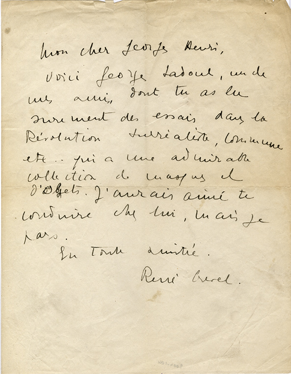 Lettre autographe signéeLettre autographe signée, adressée à « Mon cher Georges Henri ». Sans date ; 1 page in-8°. « Voici Georges Sadoul, un de mes amis, dont tu as lu sûrement des essais dans la Révolution surréaliste, [ ] qui a une admirable...