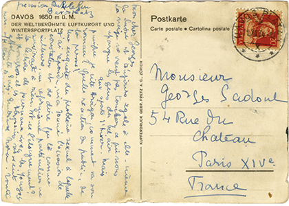 Carte autographe signéeCarte autographe signée, adressée à Georges Sadoul. Pension Richelieu, 9 avril 1934 ; sur carte postale représentant Davos (Suisse). « La Suisse est toujours égale à elle-même. La neige ne veut pas tomber ce qui nous épargne les...