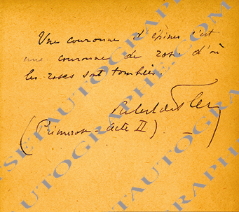 Pensée autographe signéePensée autographe signée. 1/2 page in-8°. Extrait de Primerose (acte II) : « Une couronne d’épines c’est une couronne de roses d’où les roses sont tombées. Robert de Flers »