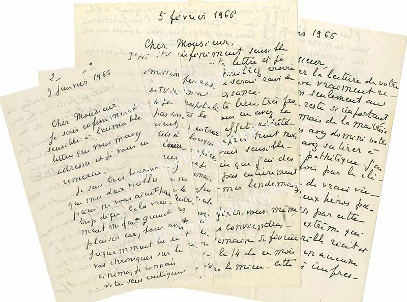 Lettres autographes signéesEnsemble de 3 lettres autographes signées :— 9 janvier 1966 ; 6 pages in-8°. « Je suis très heureux que mes deux veilles pièces ne vous aient pas trop déçu. Cela vraiment me fait grand plaisir car, pour avoir fréquemment lu de...