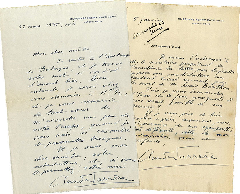 Lettres autographes signéesEnsemble de 2 lettres autographes signées, adressées à Louis Madelin : 5 janvier ; 1 page in-8°. « Je viens dadresser à M. le secrétaire perpétuel de lacadémie, la lettre par laquelle je pose ma candidature au fauteuil...