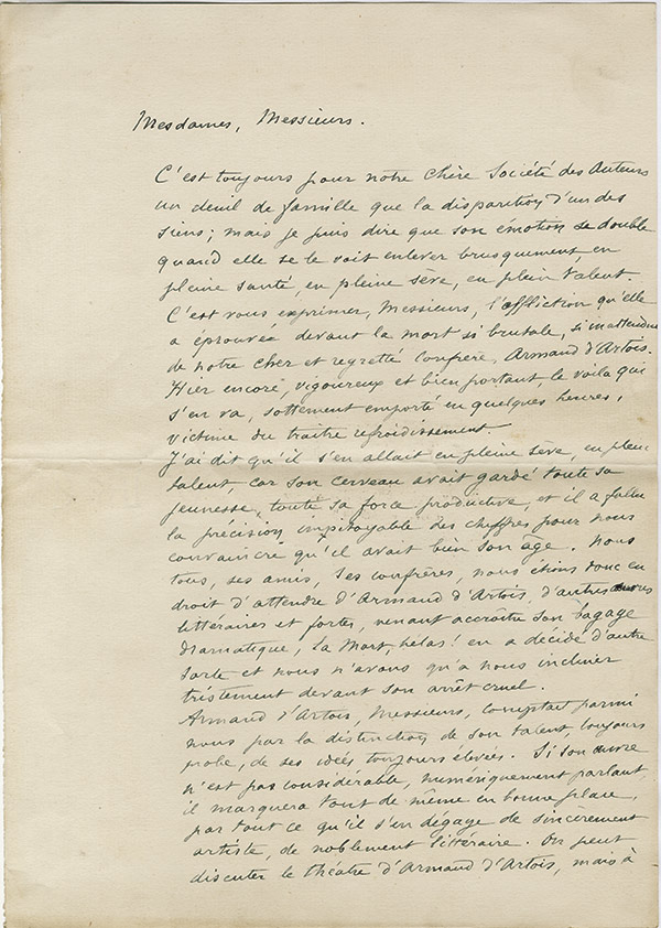 Pièce autographe signéePièce autographe signée adressée à un ami. 1 page et demie in-8° oblong, écrit sur une carte papier bleue avec son monogramme. au sujet de la pièce “Le Dindon” jouée par un anglais. ...