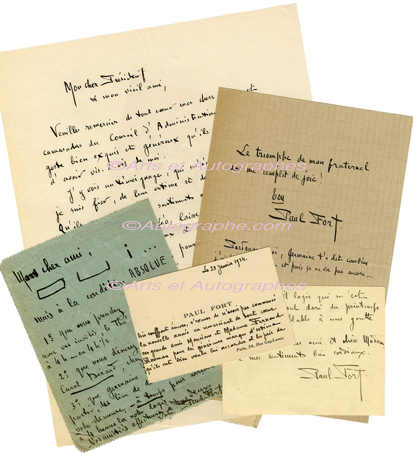 Pièce autographe signéePièce autographe signée. 125 X 165 mm. Son portrait imprimé sur la petite plaquette éditée par le Comité des amis de Paul Fort avec envoi autographe signé à Marcel Fournier. « En haute estime d’art et bien cordial souvenir et en...