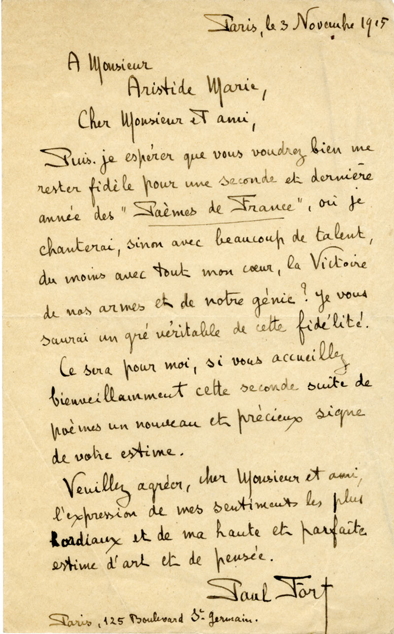 Lettre autographe signéeLettre autographe signée, adressée à Aristide Marie [1862 - 1938], essayiste, spécialiste de Gérard de Nerval et avoué français. Paris, 3 novembre 1915 ; 1 page in-8°.« Puis-je espérer que vous voudrez bien me rester fidèle pour...