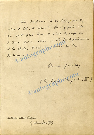Pièce autographe signéePièce autographe signée. 5 décembre 1919 ; 1 page in-8°. Extrait des « Noces d’Argent, II ». « La tendresse et la chair, vois-tu, c’est si lié, si voisin !... On s’y perd ... on ne saiT plus bien si c’est le corps ou...