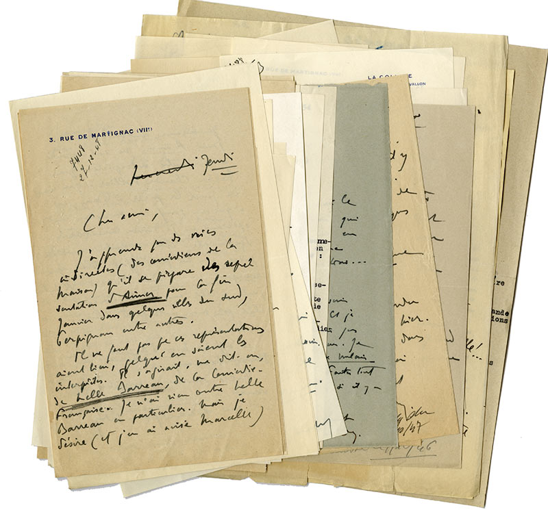 Ensemble important de 42 lettres autographes signées et un contrat signéEnsemble important de 42 lettres autographes signées et un contrat signé (pour Les Noces d’argent). 1946-1958.Il est beaucoup question de ses affaires au théâtre, du montant de sa pension, des représentations de pièces diverses,...