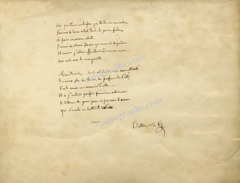 Poème autographe signéPoème autographe signé « Arthur de G. », sur 2 pages in-4° oblongues, issues d’un album amicorum. 24 vers.« Autrefois, autrefois, j’aimais aussi les fleurs,Quand je passais auprès je leur disais : mes sœurs ;Ah ! Car...