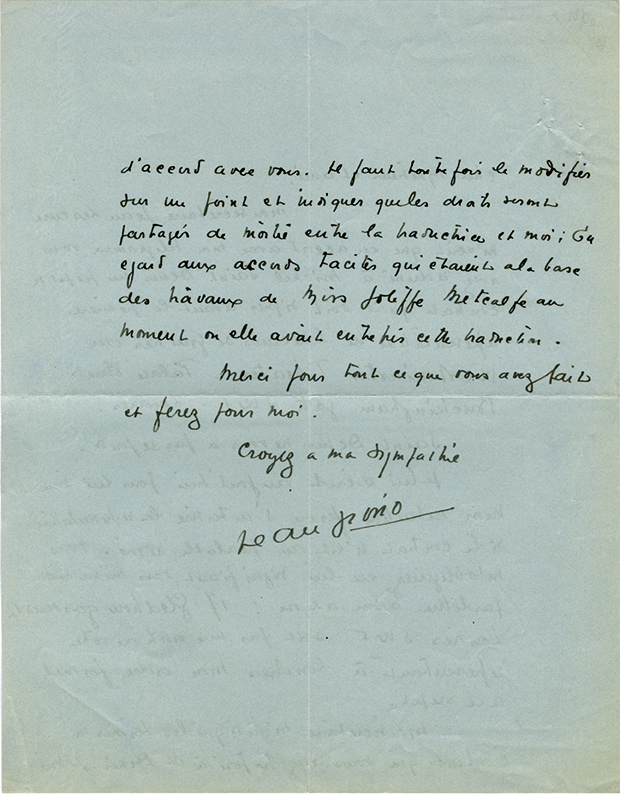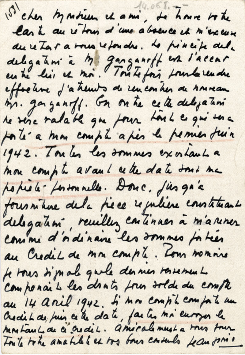 Carte autographe signéeCarte autographe signée, adressée à M. Leclair, agent général de la Société des auteurs et compositeurs. [Manosque 12 juin 1942] ; 1 page in-12. « Le principe de la délégation à M Garganoff est l’accord entre lui et moi....