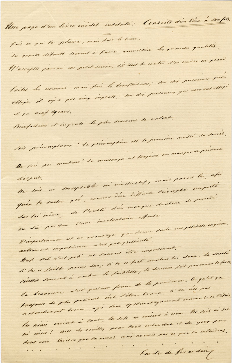 Manuscrit autographe signéManuscrit autographe signé « Une page de livre inédit intitulé : Conseils d’un père à son fils ». 1 page in-8°.« Fais ce qui te plairas, mais faits le bienLes grands défauts servent à faire amnistier les grandes...