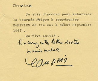 Lettre signéeLettre signée. [Manosque], le 6 septembre 1966 ; 1 page in-8°. Autorisation à la Tournée Saigre à représenter Domitien de fin mai à début septembre 1967. Il ajoute à la main : « Excusez cette lettre dictée, je suis malade. »