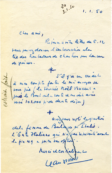 Lettre autographe signéeLettre autographe signée [adressée à la Société des auteurs et compositeurs]. 1er janvier 1950 ; 1 page in-8°. « Réponse à votre lettre du 6.12 vous pouvez donner lautorisation à la Cie des Troubadours de Chartres pour Lanceur...