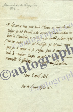 Lettre autographe signéeLettre autographe signée (en tête de la lettre), adressée à M. Quequel, jurisconsulte. Paris, 2 avril 1808 ; 1/2 page in-16. « M. Grimod est venu pour avoir l’honneur de voir Monsieur Quequel […] Il désirerait savoir quels sont...
