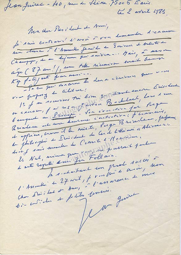 Lettre autographe signéeLettre autographe signée. Sans date ; 1 page in-4°. Rentrant de montagne, il trouve la lettre de son ami. « Je suis navré de vous savoir malade. […] Je n’ai pas besoin de vous dire que je prie pour vous matin et soir en demandant...