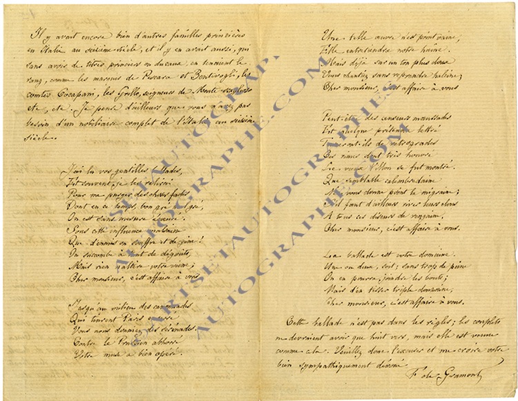 Lettre autographe signéeLettre autographe signée. 6 octobre 1873 ; 3 pages in-8°. Il énumère à son correspondant les maisons souveraines et non souveraines de l’Italie, au XVIe siècle. Puis il compose dans le corps de la lettre une ballade :« J’ai lu...