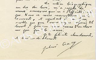 Lettre autographe signéeLettre autographe signée, adressée à M. Morvan Lebesque, journaliste et condisciple de Julien Gracq au lycée Clemenceau de Nantes. Le 30 octobre ; 1 page in-8°. « Ton livre m’attendait à St Florent et je t’en remercie bien tard....