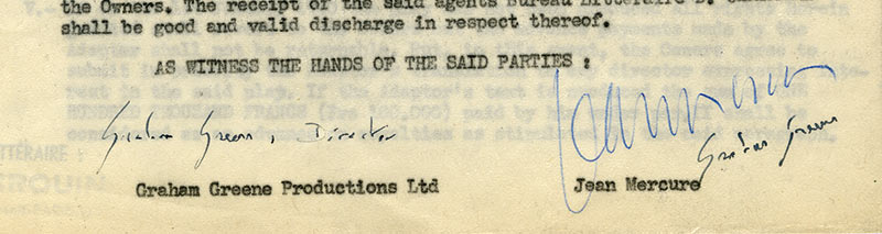 Contrat dactylographié signé deux foisContrat dactylographié signé deux fois. 30 mai 1957 ; 2 pages in-4°. Contrat entre Jean Mercure de la Société des auteurs et Graham Green, directeur de production, concernant la pièce The Potting Shed. « Autorisation de traduire et...