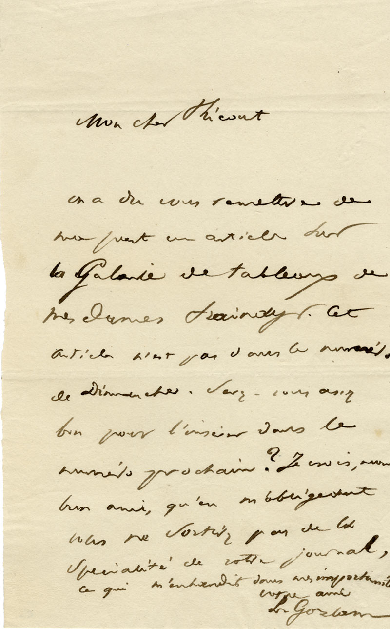 Lettre autographe signéeLettre autographe signée. 1 page in-8°. « On a du vous remettre de ma part un article sur la Galaxie de tableaux de Mesdames […]. cet article n’est pas dans le numéro de dimanche. Serez vous assez bon pour l’insérer dans le...
