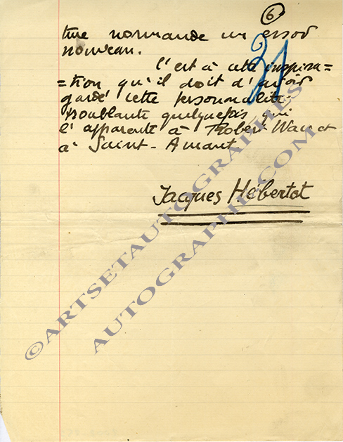 Manuscrit autographe signéManuscrit autographe signé. Sans date ; 6 pages in-4°. Il s’agit d’un brouillon de réflexions adressées à la revue L’heure qui sonne, concernant Paul-Napoléon Roinard, normand, et d’un hommage à « un Normand, de la grande...