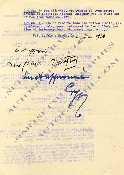 Pièce signéePièce signée. Paris, 6 juin 1924 ; 1 page 1/2 in-4°. Contrat signé avec Lucien Boyer et M. Hillier, pour les droits de son roman Le Petit Bob, afin d’en tirer une opérette en trois actes.