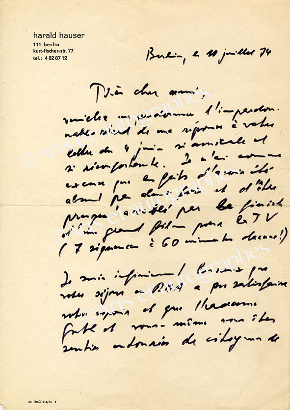 Lettre autographe signéeLettre autographe signée, adressée à Paul Guth. Berlin, 10 juillet 1974 ; 2 pages in-4°, en français. En-tête gravé à son nom et adresse. Il le prie de l’excuser du retard apporté à sa réponse, il vient de finir « un grand...