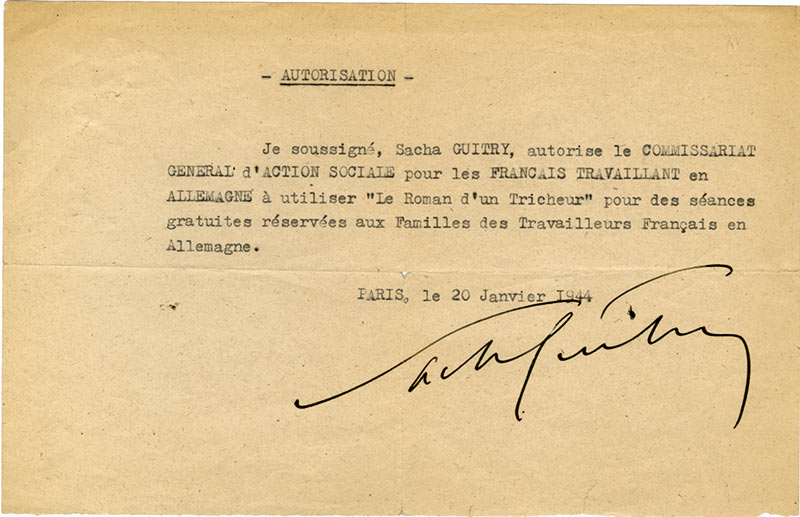 Pièce signéePièce signée. Paris, 20 janvier 1944 ; 1 page in-8° oblongue.« Je soussigné Sacha Guitry, autorise le commissariat général d’action sociale pour les Français travaillant en Allemagne à utiliser Le Roman d’un Tricheur pour des...