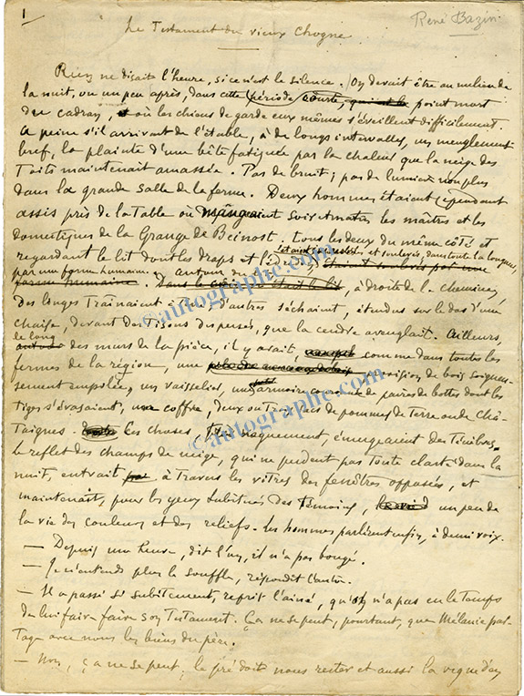 Manuscrit autographe signéManuscrit autographe signé, intitulé « Le testament du vieux Chogne ». 12 pages in-4°, avec de nombreuses ratures et corrections.