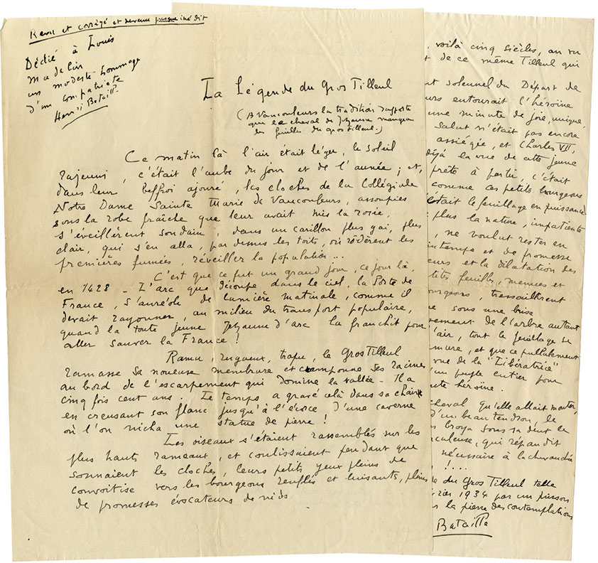 Pièce autographe signéePièce autographe signée, intitulée « La légende du gros Tilleul », dédicacée « à Louis Madelin, un modeste hommage dun compatriote. Henri Bataille. » Sans date ; 2 pages in-4°. « Ce matin là, lair était léger, le soleil...