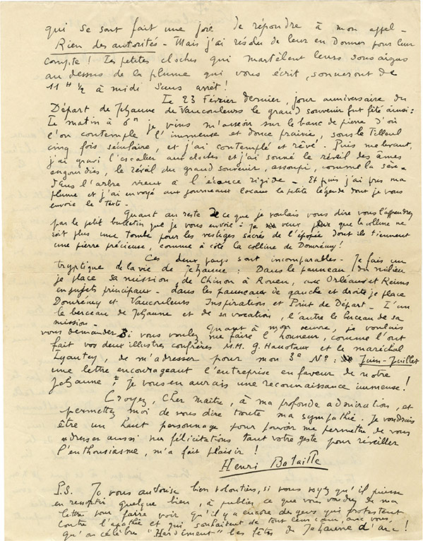 Lettre autographe signéeLettre autographe signée, adressée à Louis Madelin. Vaucouleurs, le 13 mai 1934 ; 2 pages in-4°. « Jallais vous écrire pour vous faire part de loeuvre que je viens de mettre en route ...