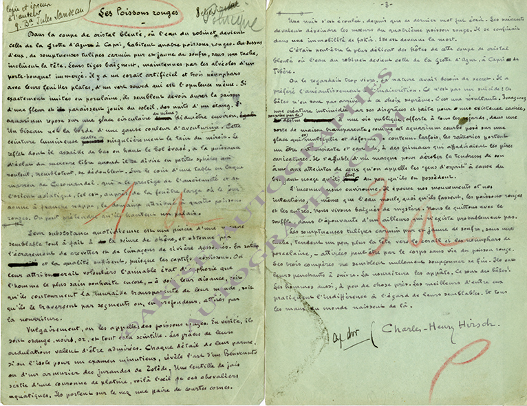 Manuscrit autographe signéManuscrit autographe signé « Les Poissons rouges ». 3 pages in-8°. Histoire de quatre poissons rouges dans un bocal à Capri.