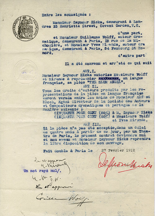 Pièce signéePièce signée. Paris, 27 février 1912 ; 1 page in-4°. Contrat entre Seymour Hicks et Guillaume Wolff et Yves Mirande, auteurs dramatiques, signé par les trois pour la représentation de la pièce The Slum Angel.