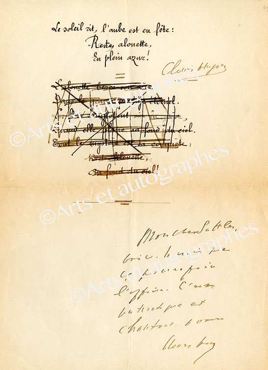 Poème signé « L’Oiseau des Gaules »Poème signé « L’Oiseau des Gaules », avec ajout autographe de 6 lignes autographes signées, adressé à un rédacteur parisien. 2 pages in-4°, fentes aux plis. « L’alouette est vaillante et libre.Libre comme les vents...