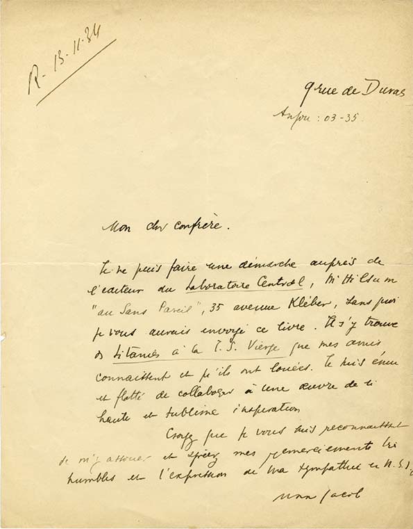 Lettre autographe signée à un confrère.Lettre autographe signée à un confrère. [13 novembre 1934] ; 1 page in-4°.« Je ne puis faire une démarche auprès de l’auteur du Laboratoire central, M. Hilsum “au Sans Pareil”, 35 rue avenue Kléber, sans quoi je vous aurais...