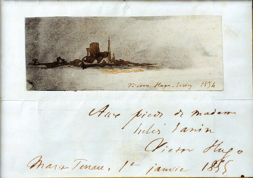 Dessin autographe signé.Dessin autographe signé. Dessin original, à la plume et au lavis, signé et daté en bas à droite « Jersey 1854 », collé sur un feuillet avec dédicace autographe signée, « Marine Terrace 1er janvier 1855 » ; environ 3,7 x 10 cm,...