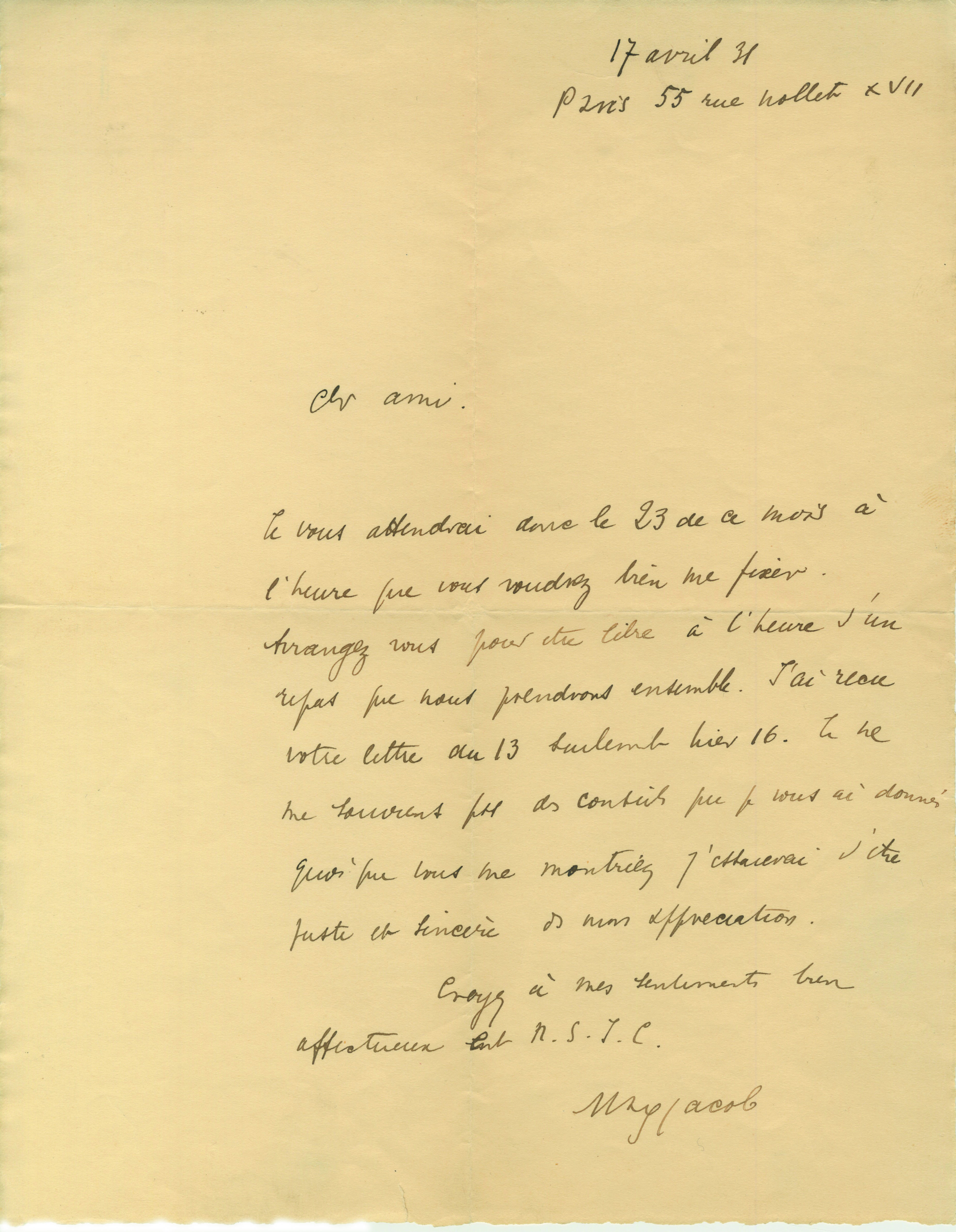 lettre autographe signéeLettre autographe signée adressée à un ami. Paris, 17 avril 1931 ; 1 page in-4° . Il invite cet ami à un repas. ...