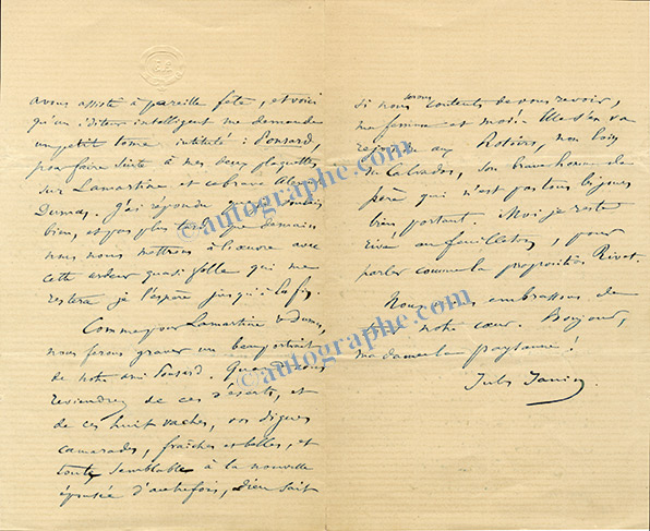 Lettre autographe signéeLettre autographe signée. [Vers 1873 ?] ; 3 pages in-12. « Chère absente ! et comment donc avez-vous su dans ces déserts que j’avais parlé de Ponsard ? Mais vous saviez bien que je ne laisserais point passer cette occasion nouvelle...