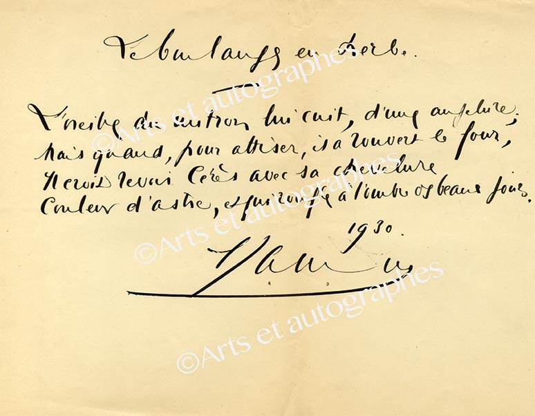 Poème autographe signéQuatrain autographe signé, intitulé « Le boulanger en herbe ». 1930 ; 1 page in-4° oblongue :« L’oreille du mitron lui cuit, d’une engelure ;Mais quand, pour attiser, il a rouvert le four,Il croit revoir Cérès avec sa...