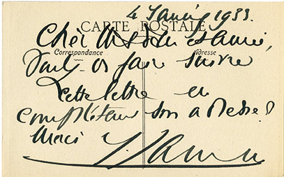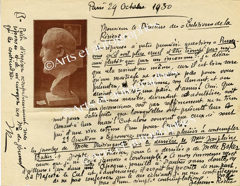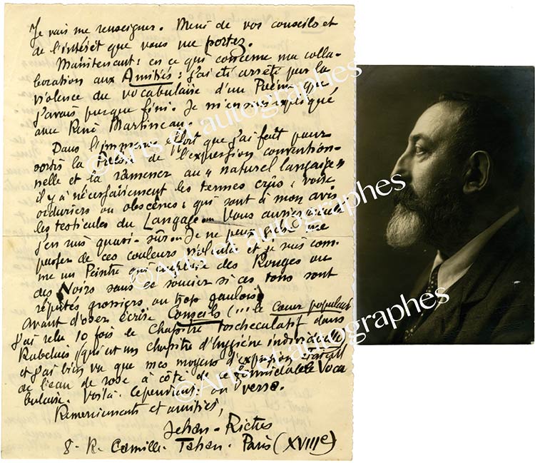 Lettre autographe signéeLettre autographe signée, adressée au directeur des Éditions de la Riviera. Nice, 4 décembre 1912 ; 1 page in-4° oblongue. Papier à lettre illustré d’un cliché représentant un plâtre de J. Rictus. « En réponse à votre...