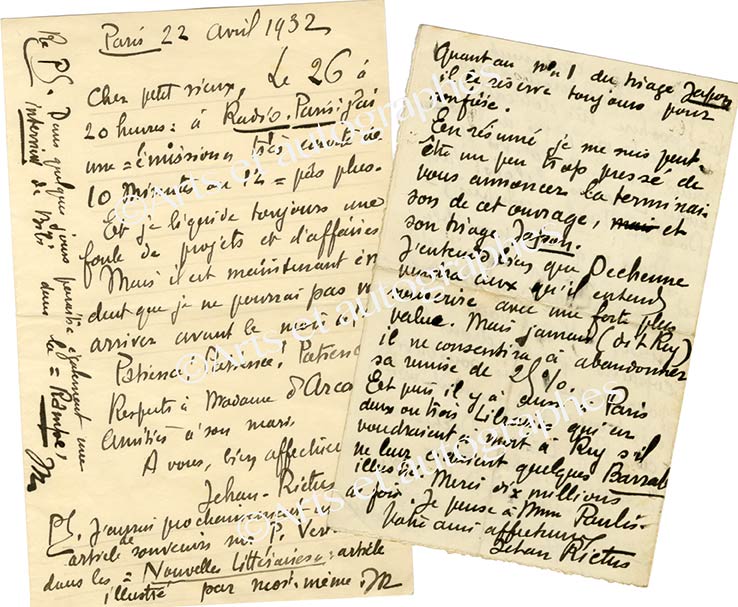 Lettre autographe signéeLettre autographe signée, adressée à Jean Tenaut. Paris, le 8 novembre 1930 ; 2 pages in-4°. « Le contrat qui me liait à Rey n’était pas tout à fait le “compte d’auteur”. Dans le compte d’auteur, il est bien rare que le...