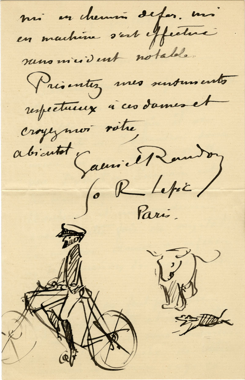 Lettre autographe signéeLettre autographe signée « Gabriel Randon », avec dessins à la fin de la lettre, adressée à Charles-Henry Hirsch. 9 juillet 1900 ; 2 pages in-8° sur papier à en-tête illustré d’une chouette. ...