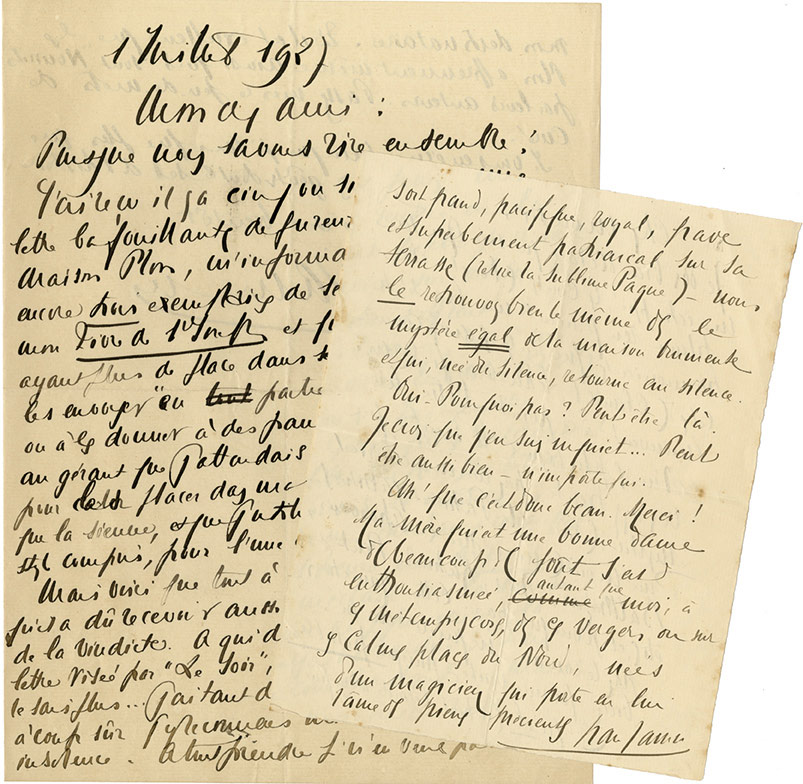 Ensemble de deux lettres autographes signéesEnsemble de deux lettres autographes signées : Lettre autographe signée. 1er juillet 1927 ; 1 page 1/2 in-4°. « Puisque nous savons rire ensemble ! Jai reçu il y a cinq ou six jours une lettre bafouillante de fureur rentrée de...