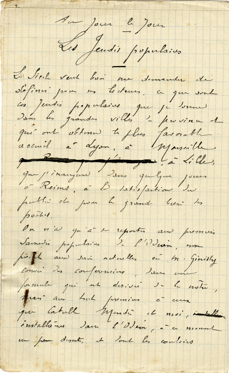 Manuscrit autographe signéManuscrit autographe signé, intitulé « Les jeudis populaires ». 9 pages in-8°. Chronique destinée à paraître dans le journal Le Siècle. « Le Siècle veut bien me demander de définir pour ses lecteurs, ce que sont ces jeudis...